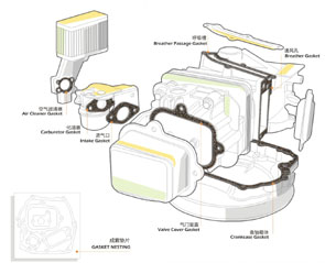 1、空氣濾清器(Air cleaner gasket) 2、化油器(Carburetor gasket) 3、進(jìn)氣口(Intake gasket) 4、氣門室蓋(Valve cover gasket) 5、通風(fēng)孔(Breather gasket) 6、呼吸槽(Breather passage gasket) 7、曲軸箱體(Crankcase gasket) |
