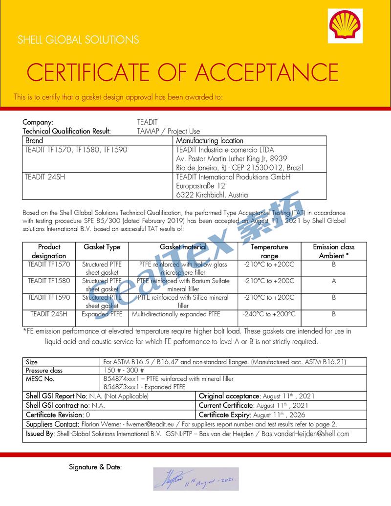 TEADIT密封材料獲得石化巨頭殼牌SHELL認可 TEADIT/泰迪密封材料獲得石化巨頭殼牌SHELL認可 涉及到的產(chǎn)品型號有:TEADIT TF1570, TF1580, TF1590,TEADIT 24SH 等 上一個 返回列表 下一個