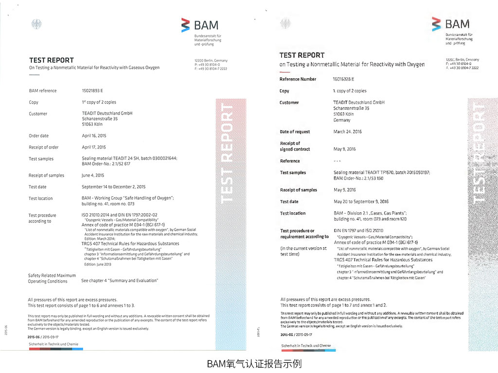 SealTex索拓合作品牌TEADIT泰迪如下型號具有BAM氧氣認(rèn)證測試報(bào)告: